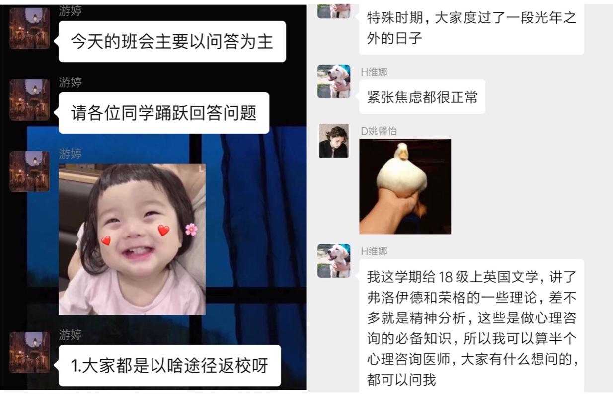 据悉,以此次返校复学为契机,英文学院各年级班主任都通过各种线上渠道,开展了以“返校复学第一课”为主题的班会,内容丰富、形式多样,涵盖了返校动员、防疫知识线上问答、心理疏导、教学工作安排、面试指导等各项同学们最为关注的内容,更好地帮助同学们消除顾虑、调整心态,以全新的姿态迎接崭新的明天!