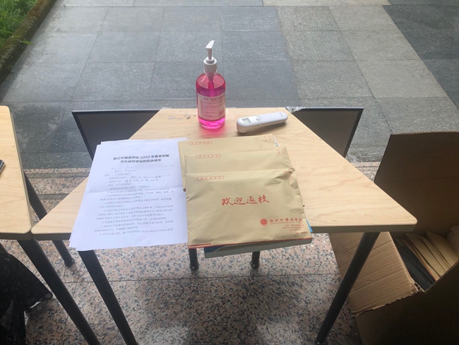 “同学! 这是学校为大家准备的爱心防疫包,里面有口罩、温度计、防疫指南,请收好。”