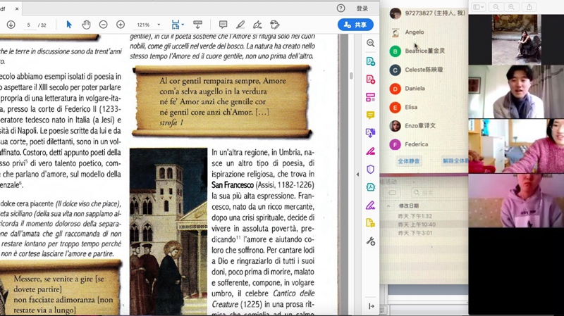 “如何看待中意人民对疫情作出的不同反应?”“如何理解语言表达所蕴涵的文化内涵?”这是西语学院意大利语专业教师周梦琪在线讲授《基础意大利语》时对同学们抛出的问题,引发学生思考。“文化背景不同,观念不同,人们的反应就会有差异”“语言是文化的表达,我们要学会用语言去准确表达我们的国家文化”......滚动在屏幕上的一条条留言记录了同学们对意大利文化的不同理解,更是记录了他们对中国文化的热爱与自信。