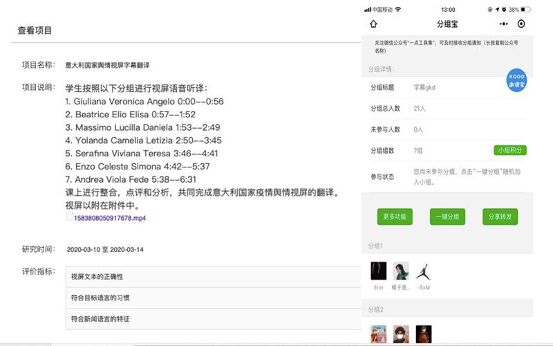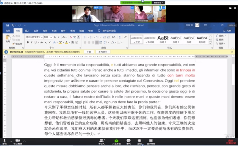 随着疫情在全球发展形势的不断变化,周老师以近期意大利媒体关于疫情的系列新闻报道为教学素材,向同学们讲解意大利语尤其是官方语言表达中特有的语言习惯和语法现象。例如,在讲到“意媒新闻的文化解读”这一知识点时,周老师设计了现场翻译新闻、解读新闻内容、分析新闻文化背景等一系列小组PK活动,来帮助学生了解意大利语新闻语言特征和表达习惯。通过带领学生阅读意媒对中国疫情不同层面的报道,分析官方媒体语言风格及其所包含的社会文化,从而加深学生对意大利国家语言文化的理解,使其在文化对比中点亮爱国情怀,增进同学们对中国文化的自信心。