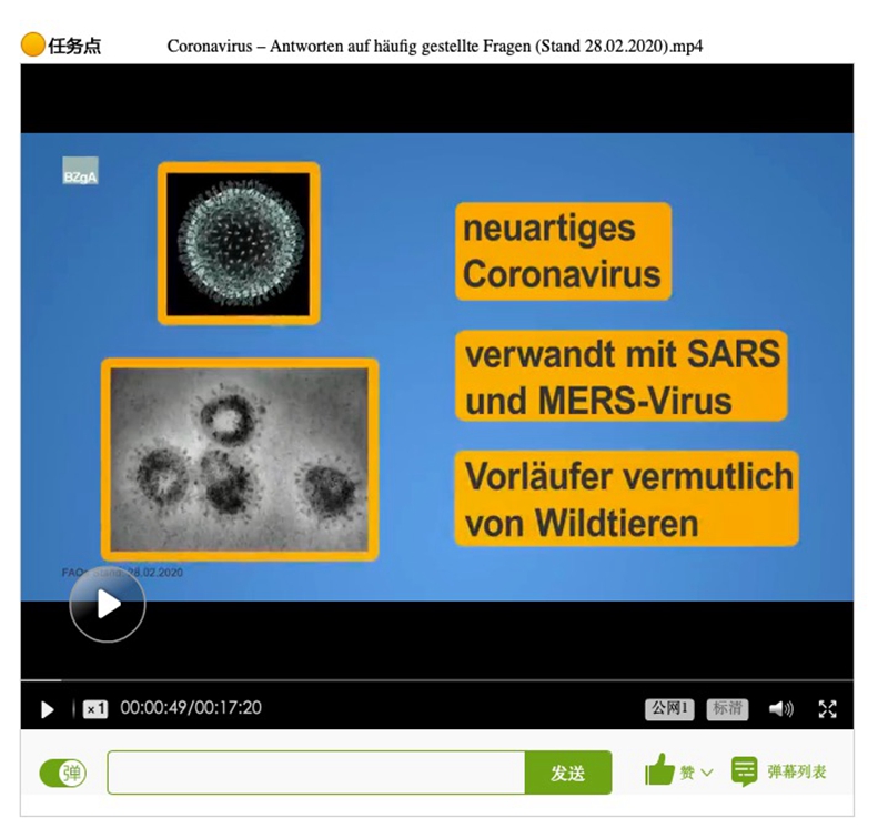 在通过课程思政育人过程中,咸老师既关注“远处”的案例,也挖掘“身边”的故事,注重将战“疫”故事转化为在线教学资源。课堂上,王嘉晨等60余名德语系学生分享了疫情爆发以来他们在关心中国疫情的同时发挥专业特长积极了解并翻译德国疫情相关信息的事迹。“疫情爆发后,我们在德留学生主动关注德国关于中国疫情的报道,至今已收集并翻译近千篇相关信息。我们希望同学们充分运用自身语言优势更加有效地向世界讲述中国故事,这是外语人促进中外理解共通的重要任务。每个平凡的青年人都是疫情见证者、亲历者,让身边人讲自己的战‘疫’故事,既有说服力,也能产生共鸣。”咸老师说。