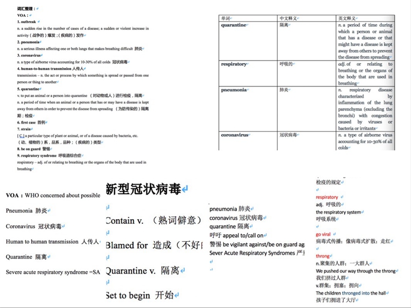 “要在持续学习中培养家国‘有心人’。”丁老师认为,口译员最本质的角色是一名掌握信息的沟通者,而要扮演好这一角色,首先是持续学习,用正确的知识与信息武装自己。这也是她在口译课堂内外反复向同学们传达的思想。在日益频繁的跨文化交流中,一名合格的译员应心中有家国,眼里观世界,应当是关注家事国事天下事的有心人。寒假之初,正值疫情爆发之时,丁老师便以疫情相关报道内容为语料,为《口译工作坊》这门课程布置了寒假学习任务。同学们按要求,尝试复述、口译关于COVID-19疫情的新闻报道,并通过平行文本听辨、阅读等,整理出疫情关键词双语表达词汇表。从第一周小测试表现来看,绝大部分同学不仅掌握了疫情相关关键词的中英双语表达,学会了如何在翻译实践中进行“中国表达”,也了解了国家是如何以“中国速度”部署与实施这场疫情防控阻击战,体会到了国家力量、人民能量的伟大。