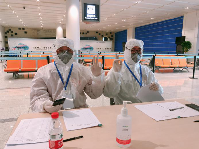 此外,在专门的车辆护送两位疑似患者前往医院前,金老师协助机场的工作人员进行了相关文件的翻译,使当晚的工作有条不紊地进行。在这个漫漫长夜里,除了身体上要承受高负荷的工作压力,还要战胜心理上的不安全感。一旦这两个疑似病人确诊了怎么办?尽管防护措施如此严密,可是谁也不能预料意外的到来。然而人命与职责当前,很多个人的感受微乎其微,更多的是承担责任,是忠于选择。