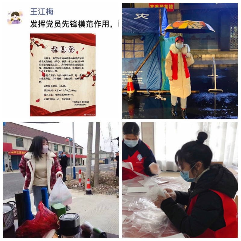 “我只是在用自己微薄的力量支持防疫工作,这是一名共产党员应该做的”,经管学院17旅管1班预备党员王江梅在看到嘉兴市志愿者的招募令后,于2月6日至8日参加了守卫家园和口罩包装志愿活动。志愿服务期间她每日要在社区出入口站岗10小时,并要完成近8000只口罩的打包工作。在完成相关志愿活动后,她还利用自己的空闲时间,给社区执勤的工作人员送去了自制的饼干、蛋糕和银耳粥等食物。