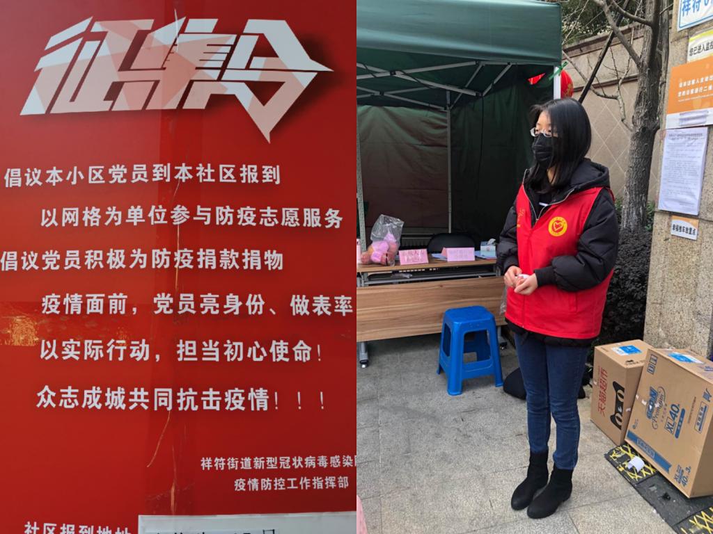 图为:高佳敏所在社区发布的党员征集令和她工作的岗位