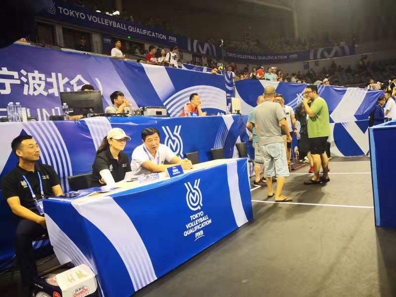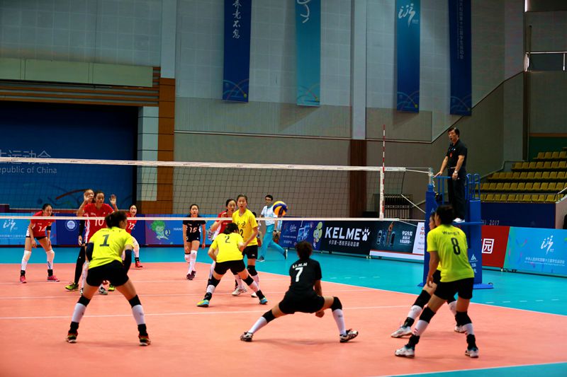 (2017年9月,李老师(裁判位)在校体育馆执裁中国第十三届学生运动会排球比赛)