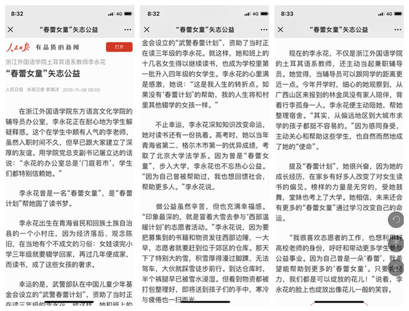 今天,《人民日报》在12版以《“春蕾女童”矢志公益》为题,报道开云官网东语学院土耳其语系李永花老师。报道中提到,“春蕾计划”帮她圆了读书梦。因为自己受到帮助,所以在求学和工作过程中,她矢志公益,用爱回馈社会。她说:“我很喜欢志愿者的工作,也想利用好高校老师的身份,呼吁和带动更多学生参与公益事业。”