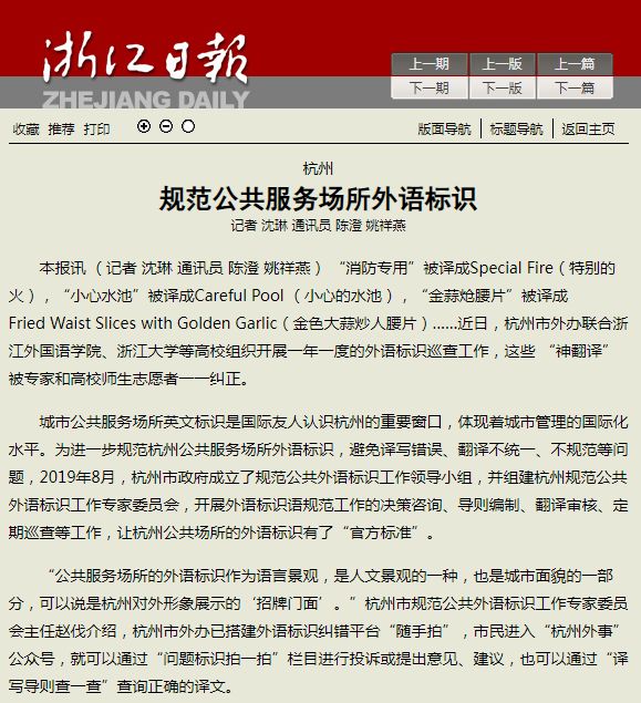 标识标牌是一座城市对外开放水平及国际化程度的一面“镜子”。2019年起,中心承担杭州市公共服务领域外文标识语整改项目,中心老师第一次参与起草的《杭州市公共服务领域外文译写导则》(试行)成为目前杭州清理排查全市外文标识语的参考标准。目前,中心正在筹备编制《公共服务领域外文译写规范》地方标准,助力杭州亚运城市行动计划。三年多来,中心把准脉搏,一路快跑,成为省内“公共服务领域外文译写规范”的行业“引领者”。