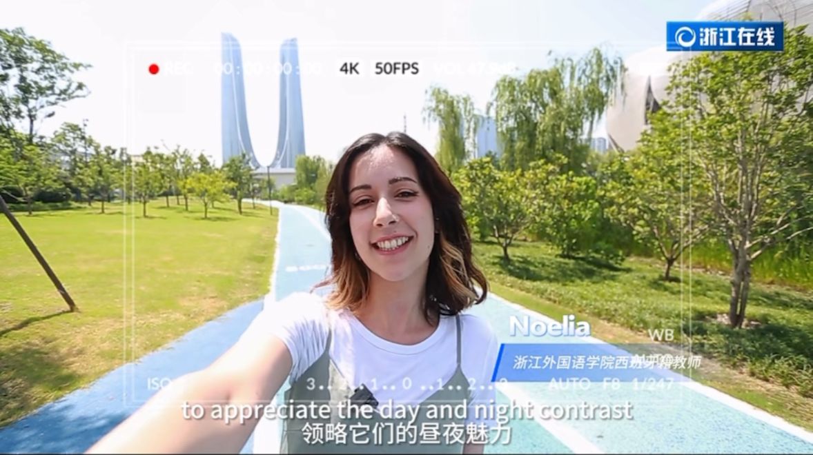 西班牙籍外教Noelia参加“共赴亚运 相约杭州”摄制。