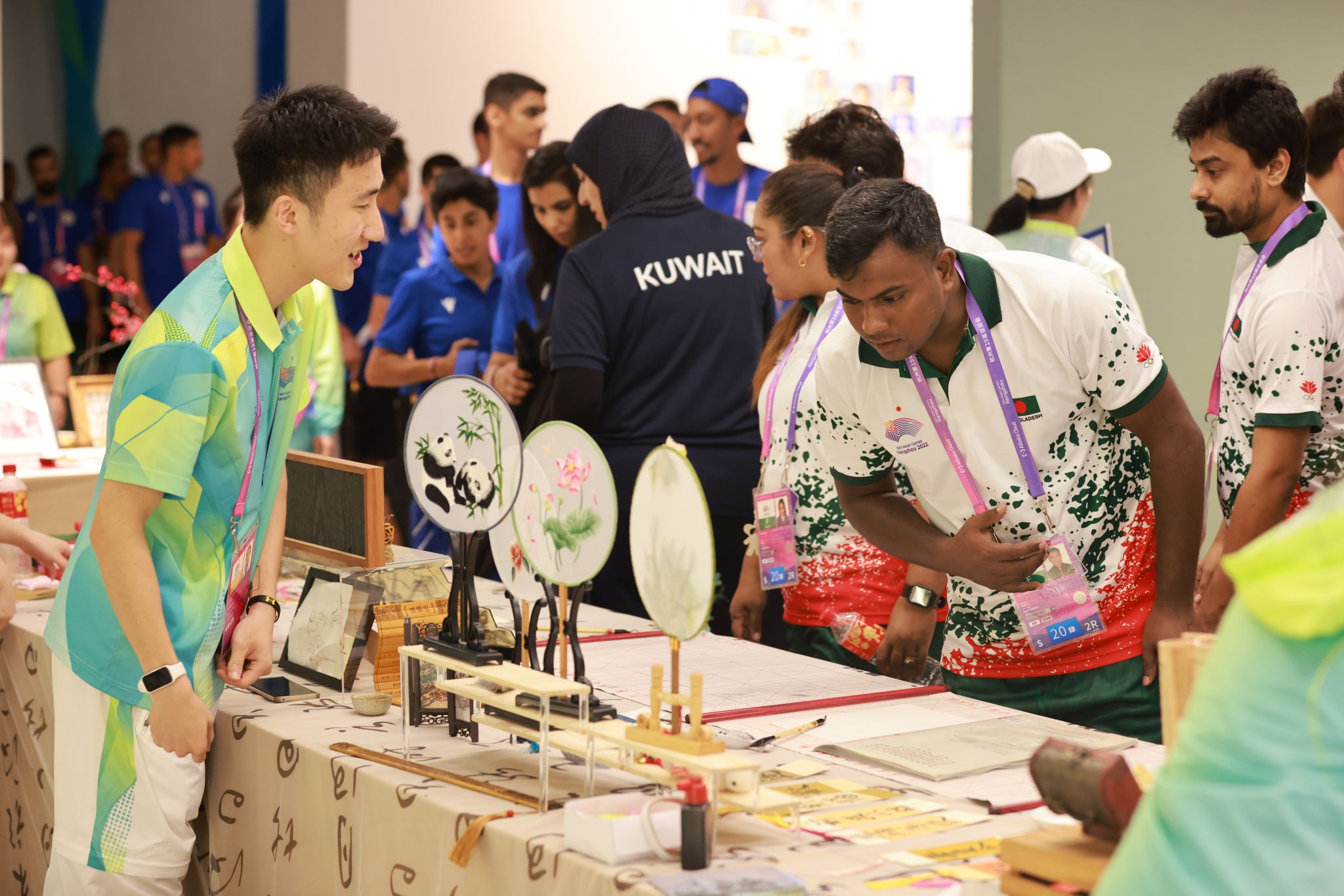 来自各国家和地区的代表团在志愿服务中心体验中国传统文化。