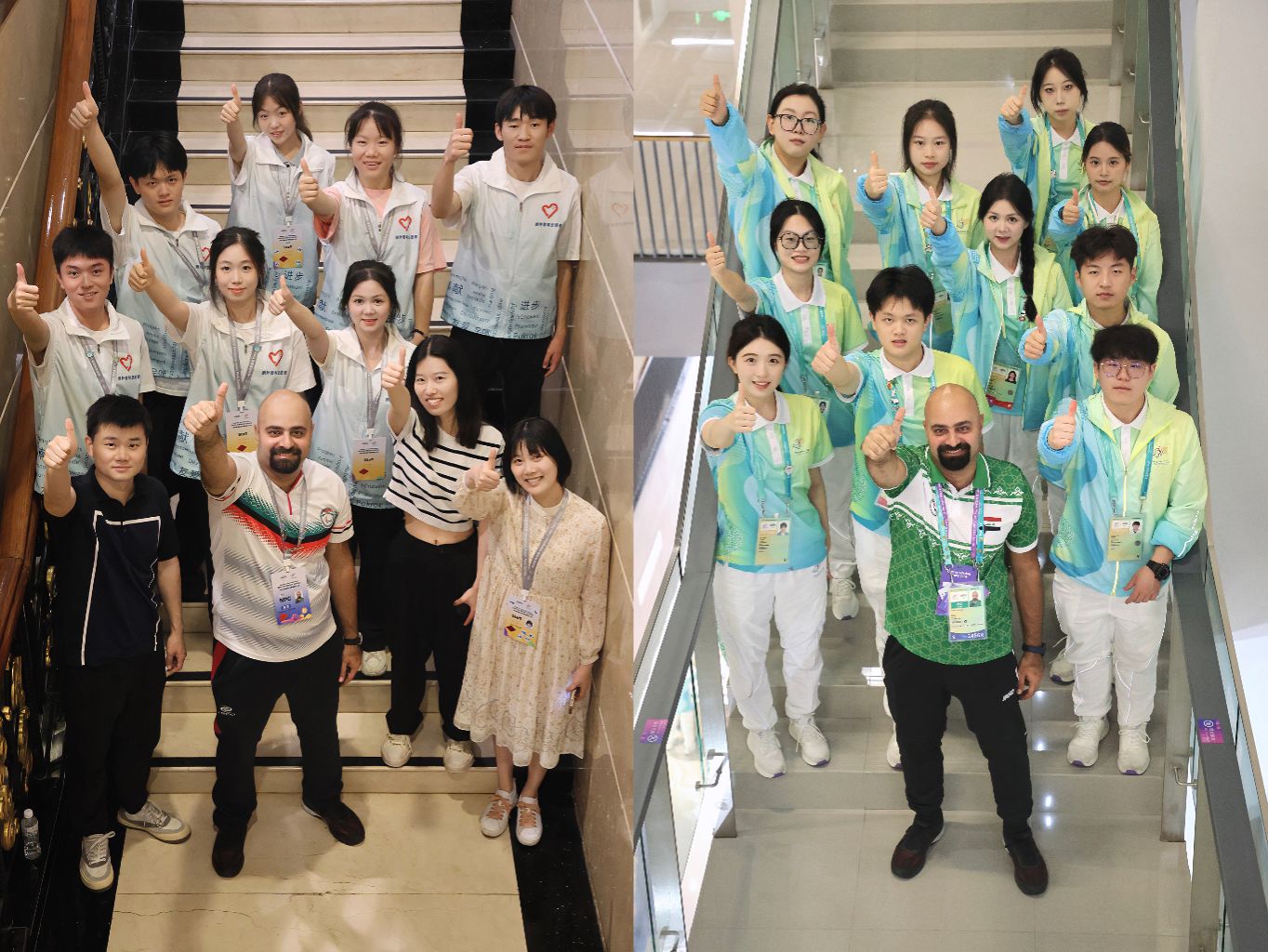 伊拉克代表团团部官员海德尔与“小青荷”复刻亚残运会代表团团长大会经典时刻。