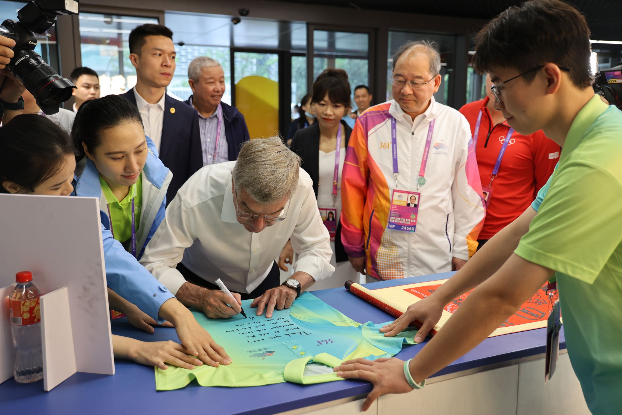 国际奥委会主席巴赫先生在志愿者短袖POLO衫上写下了感谢语。