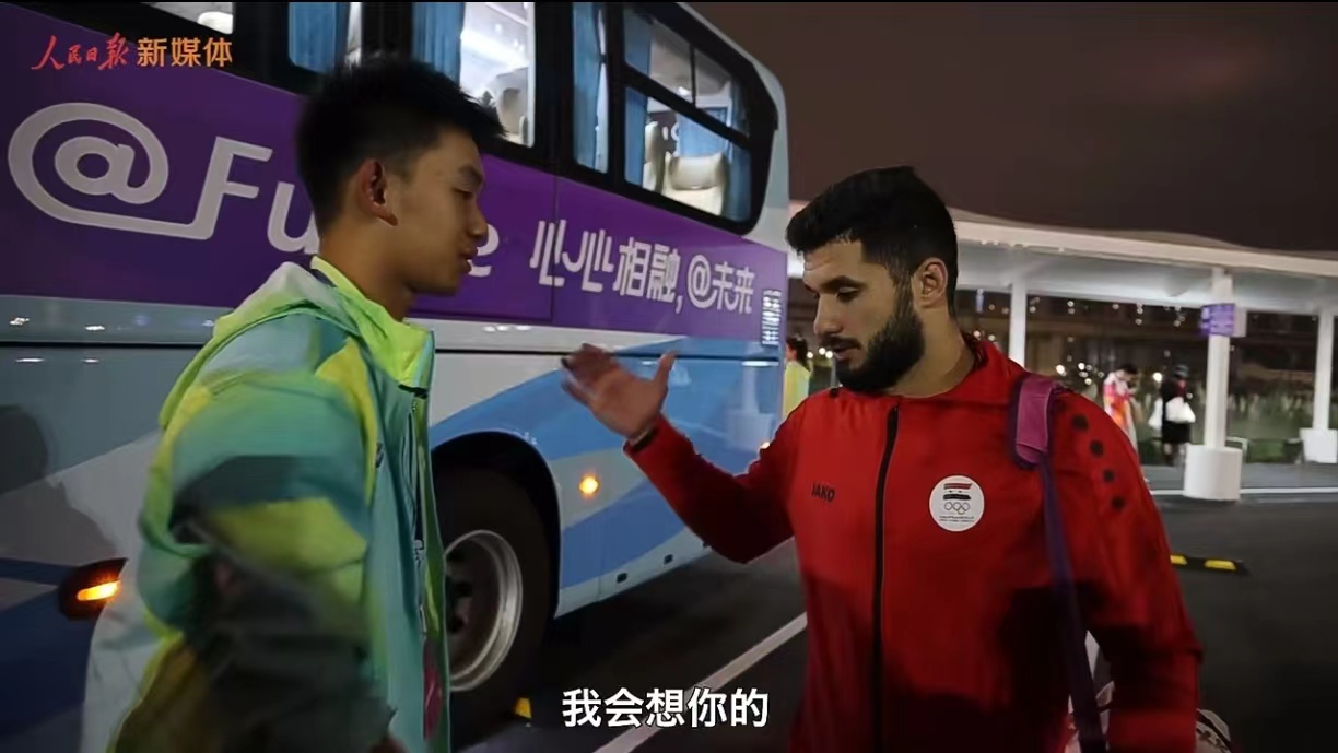 叙利亚代表团旗手艾哈迈德·古松含泪与“小青荷”蔡明喆挥别。
