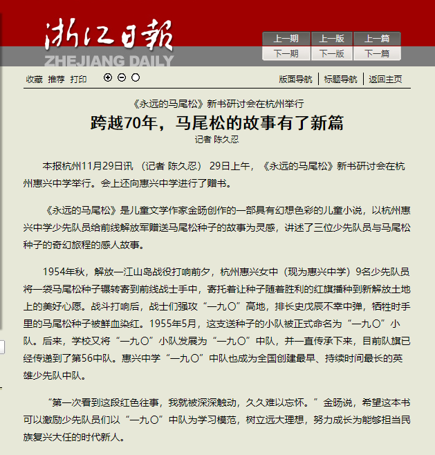 报道指出,《永远的马尾松》是儿童文学作家金旸创作的一部具有幻想色彩的儿童小说,以杭州惠兴中学少先队员给前线解放军赠送马尾松种子的故事为灵感,讲述了三位少先队员与马尾松种子的奇幻旅程的感人故事。“第一次看到这段红色往事,我就被深深触动,久久难以忘怀。”金旸说,希望这本书可以激励少先队员们以“一九〇”中队为学习模范,树立远大理想,努力成长为能够担当民族复兴大任的时代新人。