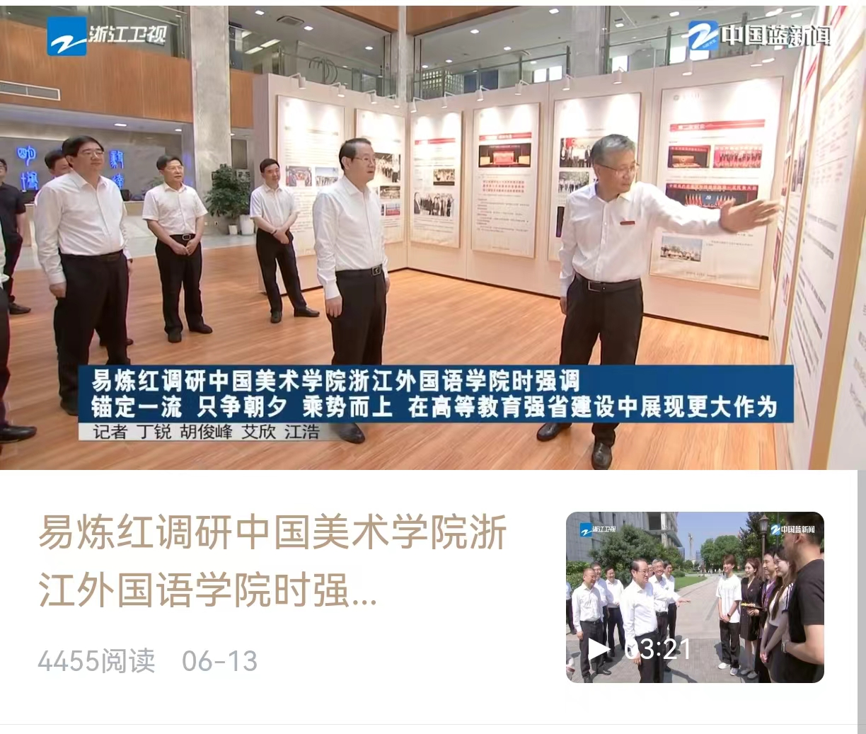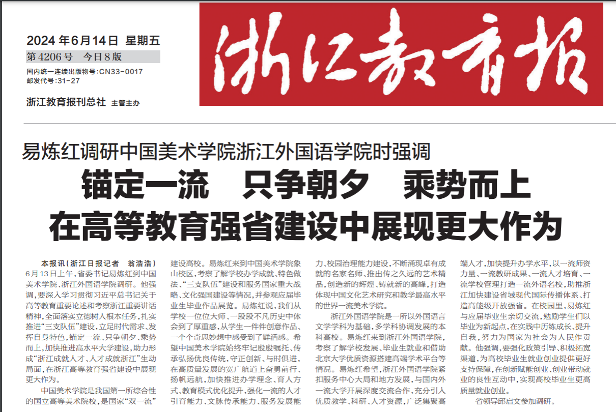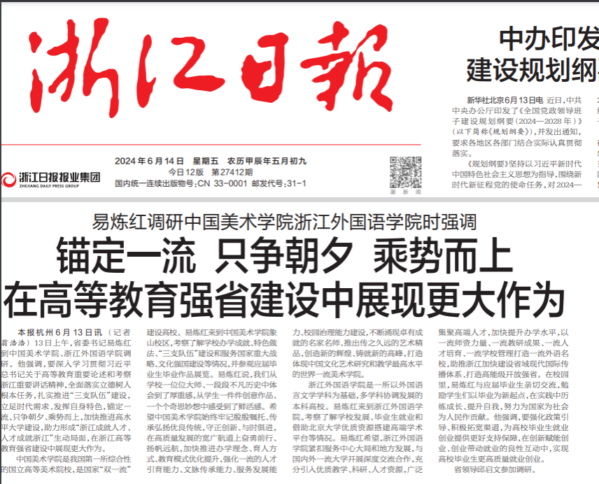 6月13日-14日,浙江日报头版头条、浙江教育报头版头条、浙江新闻联播、新华网、人民日报客户端、中国网、潮新闻、浙江在线、浙江发布、“学习强国”浙江学习平台、今日浙江公众号、今日浙江强国号、教育之江等24个媒体平台分别以“易炼红调研中国美术学院kaiyun开云官方时强调锚定一流只争朝夕乘势而上在高等教育强省建设中展现更大作为”等为题,报道了省委易炼红书记调研有关情况。