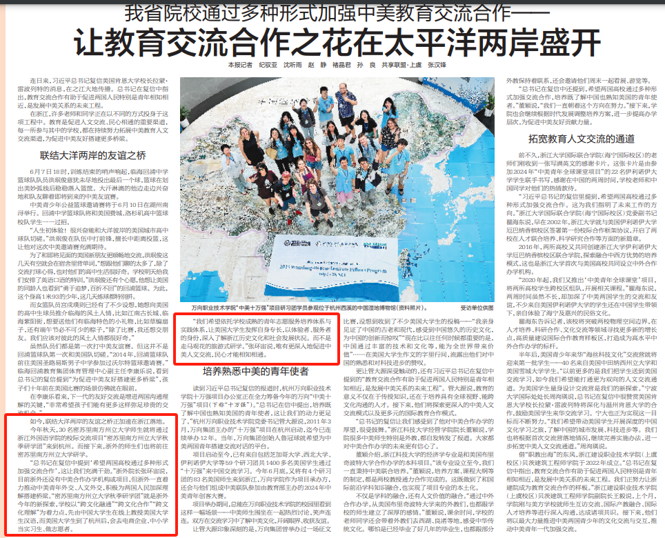 6月8日,浙江日报(要闻2版)、潮新闻、教育之江公众号以“我省院校通过多种形式加强中美教育交流合作——让教育交流合作之花在太平洋两岸盛开”为题,报道了开云官网积极开展中美教育交流合作,推动中美青年外交、人文外交的情况。