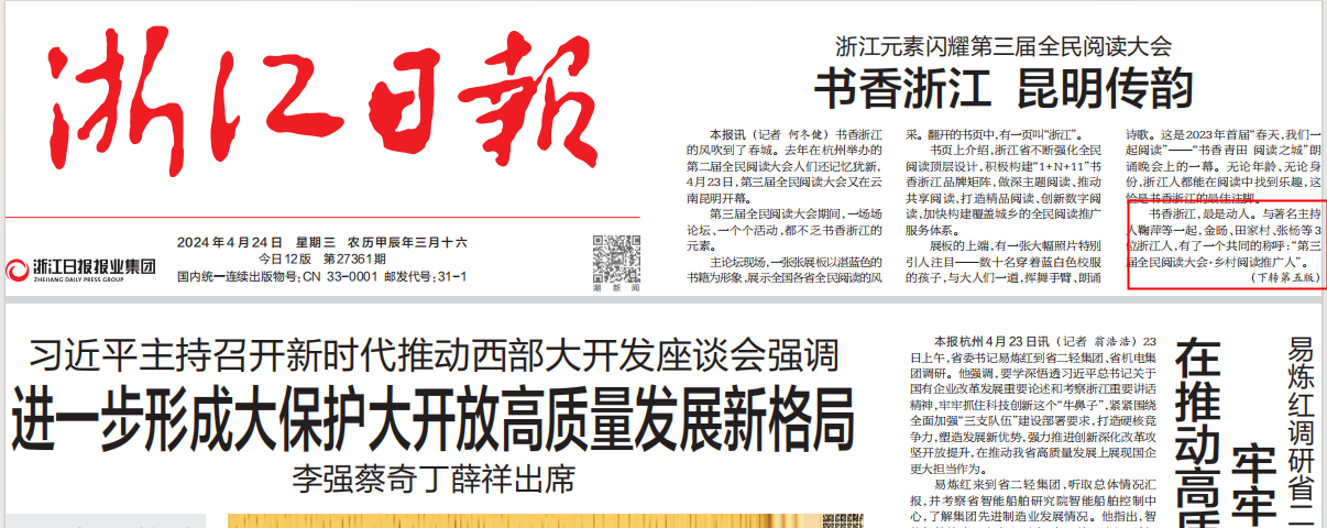 4月24日,浙江日报以“书香浙江 昆明传韵 浙江元素闪耀第三届全民阅读大会”采访报道了开云官网中外全民阅读文化研究中心主任、中文学院金旸老师助力乡村阅读推广的故事。