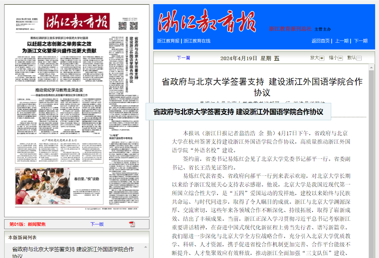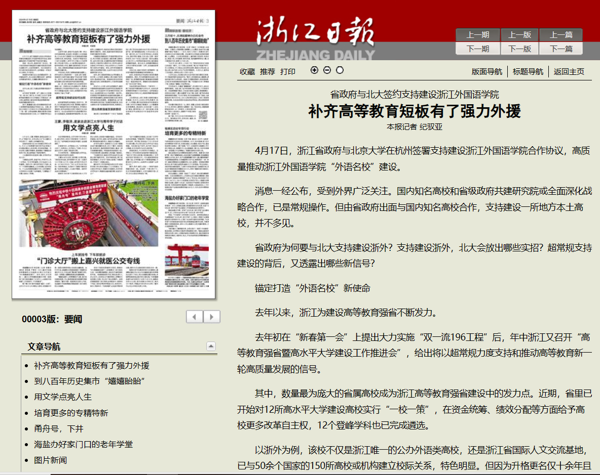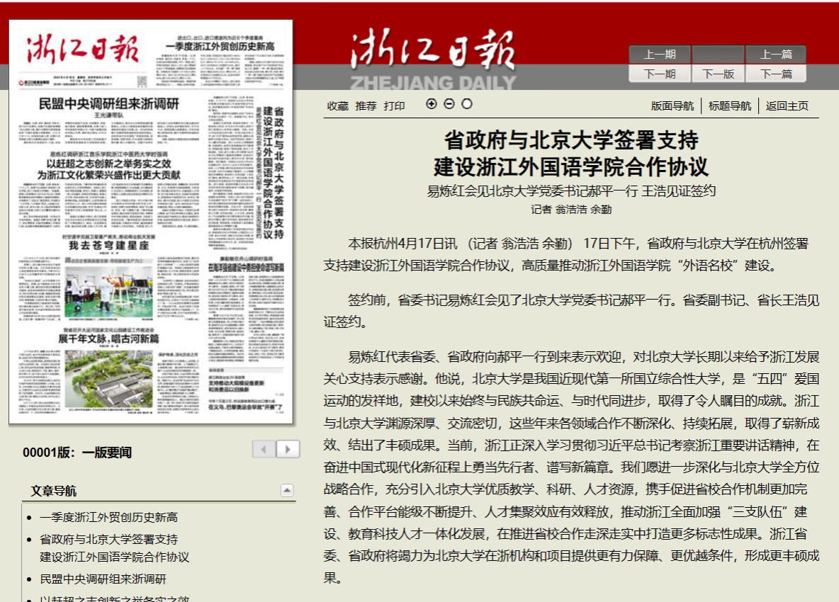 4月17日-19日,《浙江日报》头版、要闻版,《浙江教育报》头版头条,浙江新闻联播,央视网、光明日报客户端、中国青年报客户端、中国报道网、浙江在线、浙江发布、今日浙江、潮新闻、“学习强国”浙江学习平台、教育之江、凤凰网等媒体以“省政府与北京大学签署支持建设kaiyun开云官方合作协议 易炼红会见北京大学党委书记郝平一行 王浩见证签约”“kaiyun开云官方引来北大做‘外援’透露这些重要信号”等为题,报道了浙江省政府与北京大学支持建设kaiyun开云官方的情况。