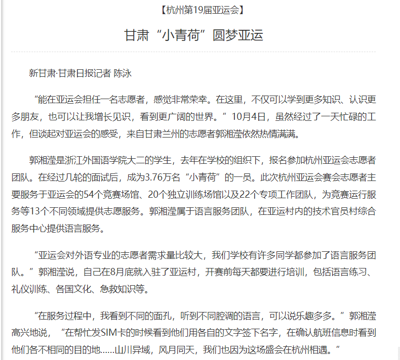 9月30日-10月5日,新华网、甘肃日报、“学习强国”甘肃学习平台、新甘肃客户端分别以《甘肃“小青荷”圆梦亚运》《甘肃兰州的“小青荷”笑起来很甜》为题,报道了开云官网甘肃籍“小青荷”郭湘滢、方纾羽的志愿服务故事。