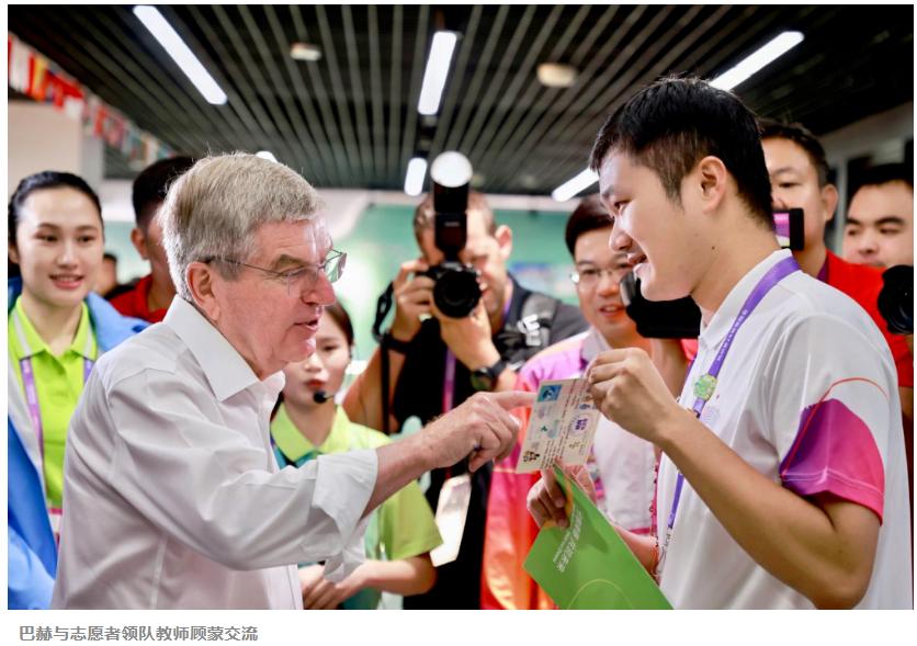 报道指出,走进志愿服务中心,朝气蓬勃的“小青荷”微笑相迎,传递出满满的青春活力。巴赫热情地和志愿者们打招呼,向他们赠送奥运五环徽章,还在志愿者短袖POLO衫上写下了感谢语:“Thank you very much to all the wonderful volunteers for your great hospitality and your big smile.”(感谢所有出色的志愿者,谢谢你们的热情好客和灿烂笑容。)参观过程中,来自kaiyun开云官方的“小青荷”向巴赫送上了志愿者歌曲《等你来》的快闪舞蹈,热情洋溢的舞姿彰显志愿者风采;现场极具中国特色的面具彩绘、拓印、书法展也深深吸引巴赫驻足;志愿者领队教师顾蒙用西语介绍自己在南京青奥会时和巴赫结下的缘分,并赠送明信片,寓意志愿服务精神代代相传。