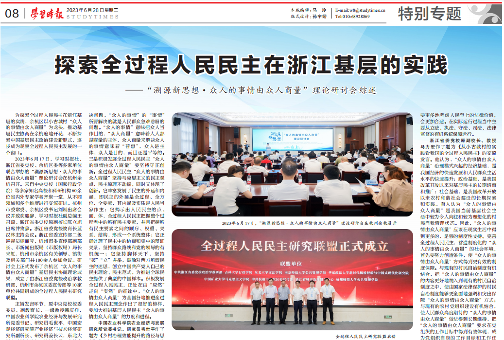 6月28日,《学习时报》特别专题版以《探索全过程人民民主在浙江基层的实践—“溯源新思想·众人的事情由众人商量”理论研讨会综述》为题,报道了副校长、党委委员李安出席在杭州余杭召开的“溯源新思想·众人的事情由众人商量”理论研讨会并作发言。