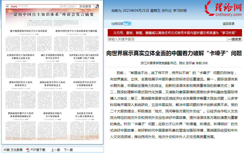 4月21日《学习时报》文化教育版,4月16日学习时报公众号,分别以《“建构中国自主知识体系”座谈会发言摘要》《11位大学书记校长共议“建构中国自主知识体系”》为题,报道了校长张环宙作为“全国高校党委书记校长提高政治能力专题培训班(第3期)”学员,出席在中央党校(国家行政学院)举行的主题座谈会并作发言。