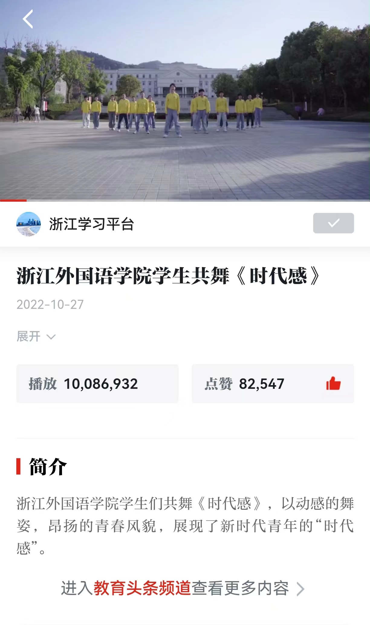 10月26日-30日,“学习强国”全国学习平台、“学习强国”浙江学习平台、浙江卫视、浙江教育报强国号、浙江卫视牛视频、中国教育在线浙学少年视频号分别关注报道开云官网学子共舞《时代感》,以动感的舞姿,昂扬的青春风貌,展现了新时代青年的“时代感”。