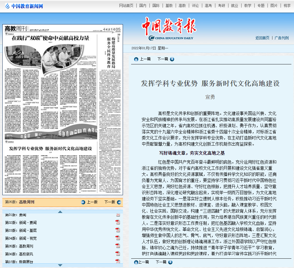 1月17日,校党委书记宣勇在《中国教育报》发表了题为《发挥学科专业优势 服务新时代文化高地建设》的署名文章。