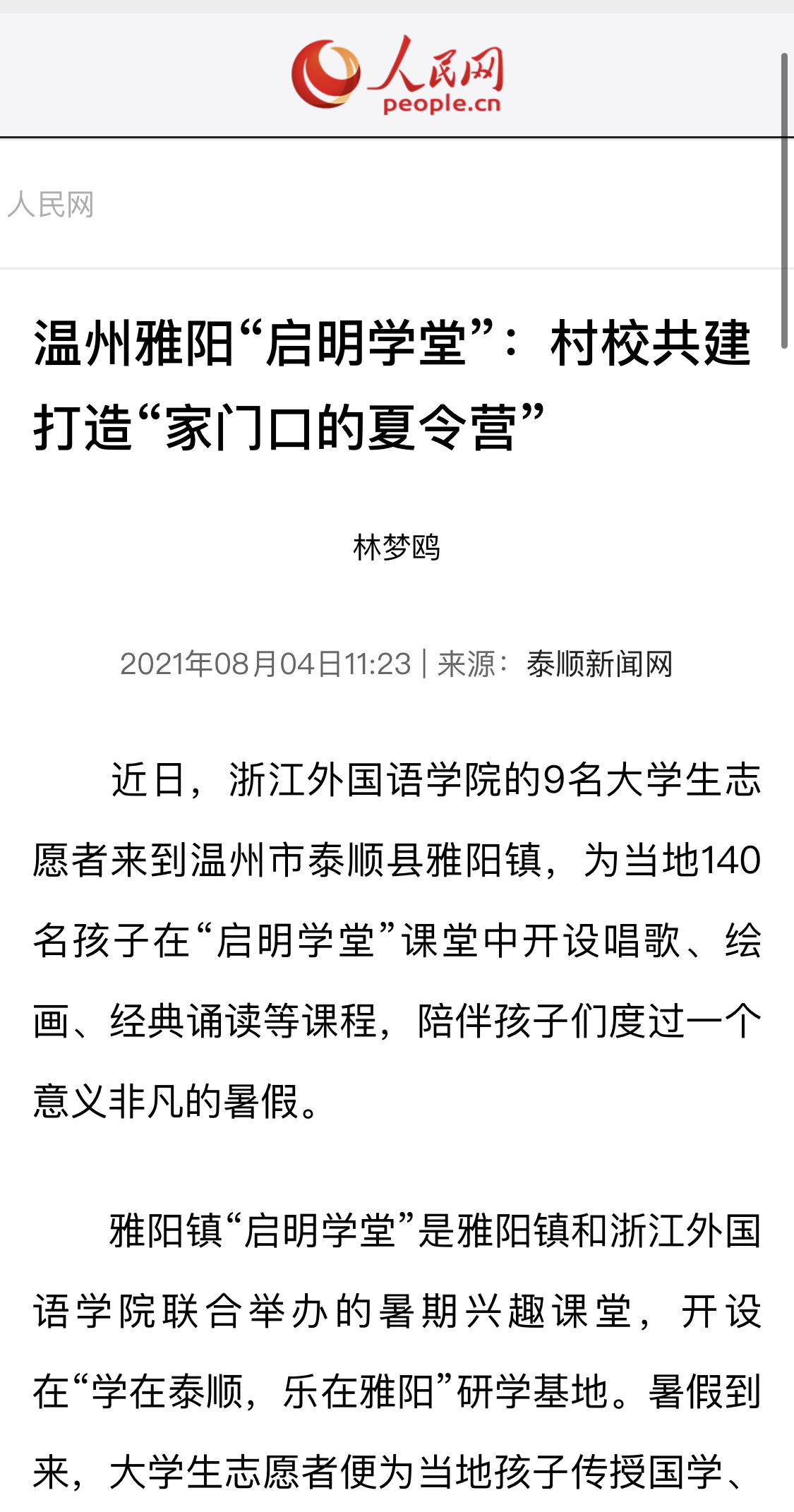 近日,人民网、新华网、“学习强国”平台等多家媒体关注报道了浙外学子赴温州泰顺雅阳镇kaiyun开云官方“青年学子学青年习近平”学习教育实践基地,发挥专业优势,开展暑期研学支教等文化活动。