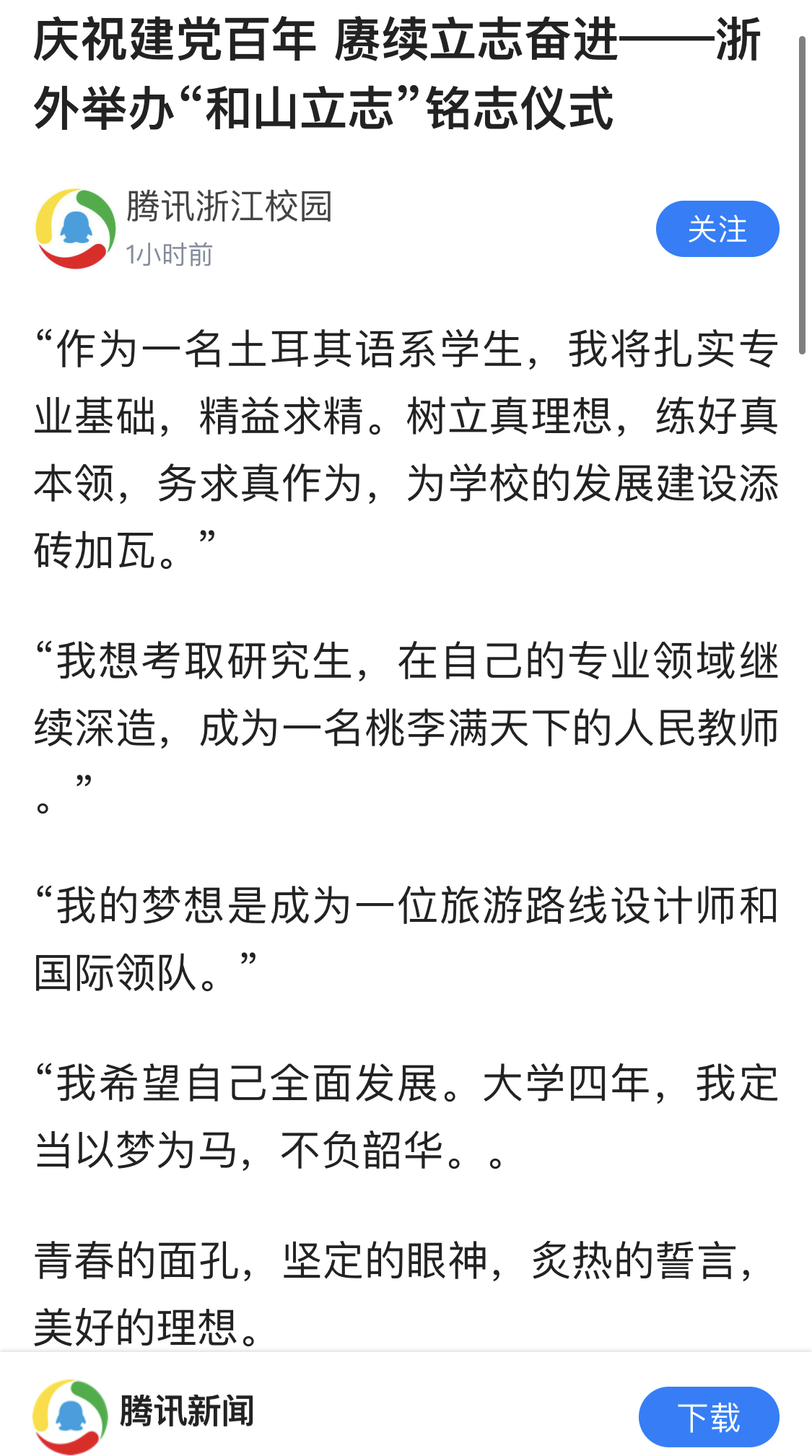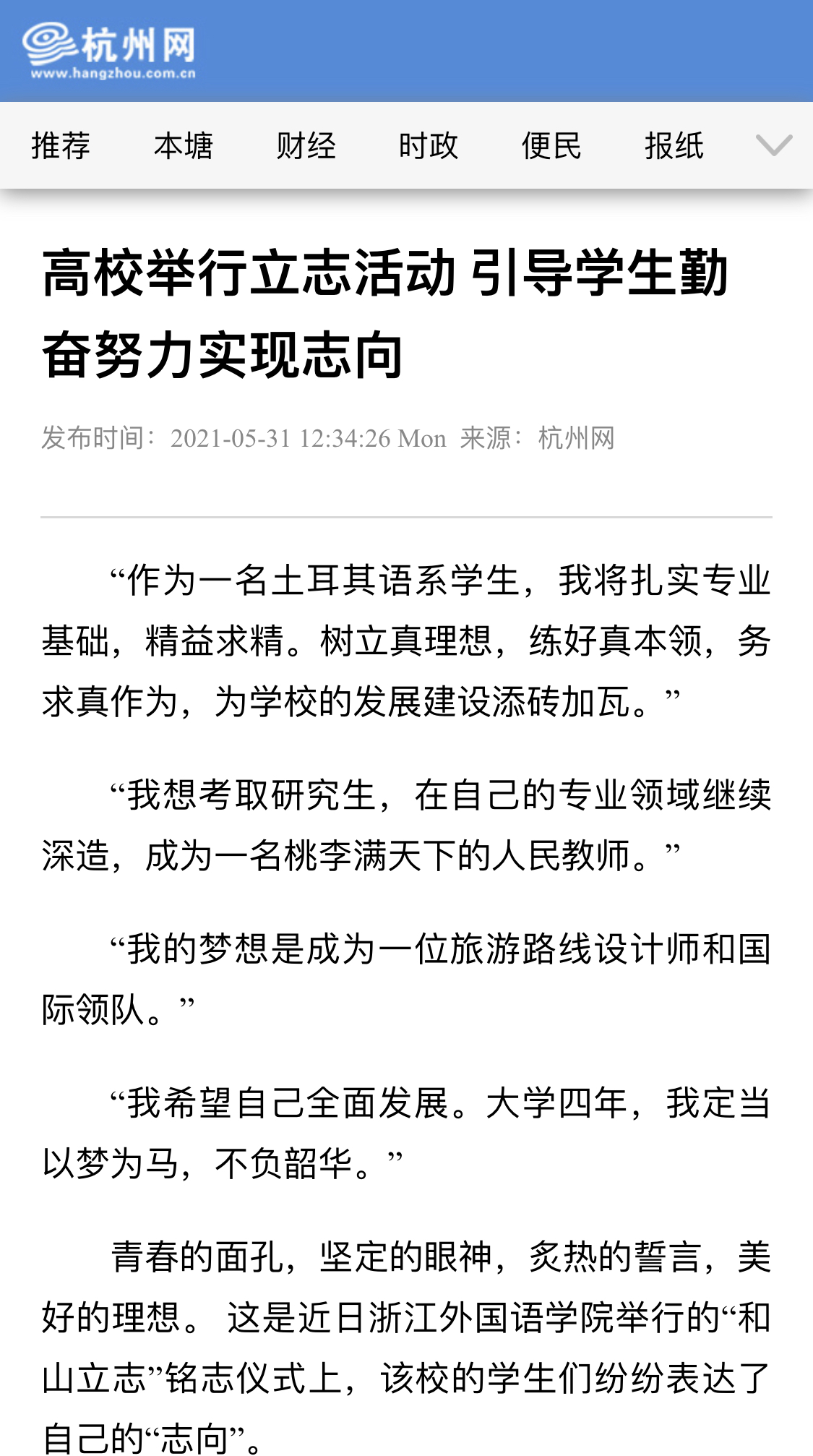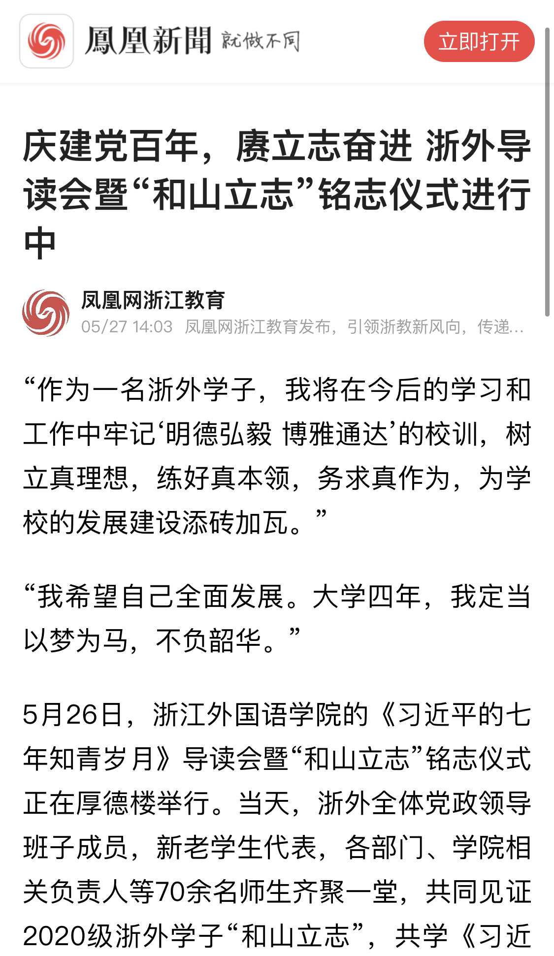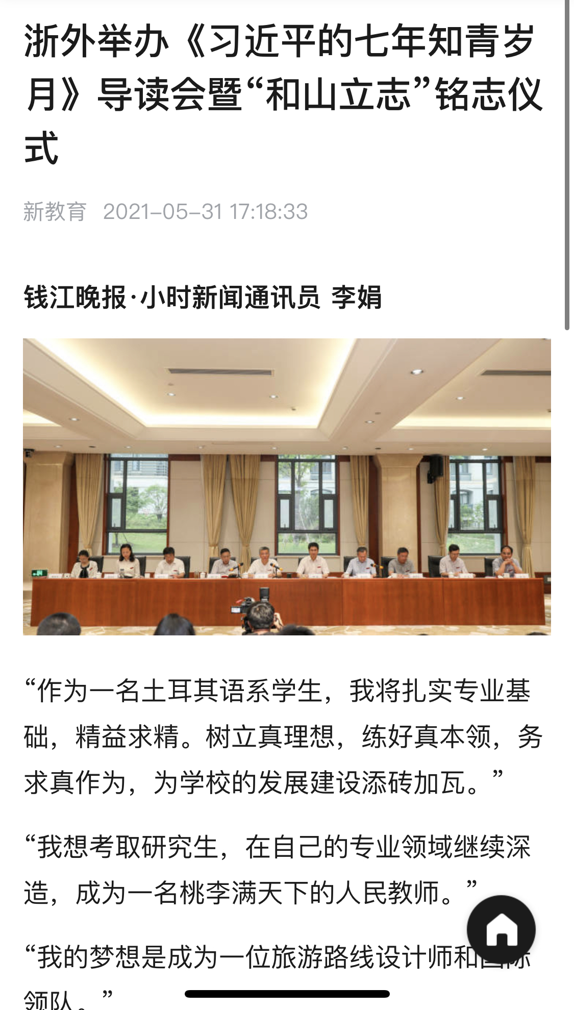 近日,浙外举办《习近平的七年知青岁月》导读会暨“和山立志”铭志仪式。凤凰网等多家媒体分别以“庆建党百年,赓立志奋进 浙外导读会暨“和山立志”铭志仪式进行中”“高校举行立志活动 引导学生勤奋努力实现志向”等为题进行了关注报道。