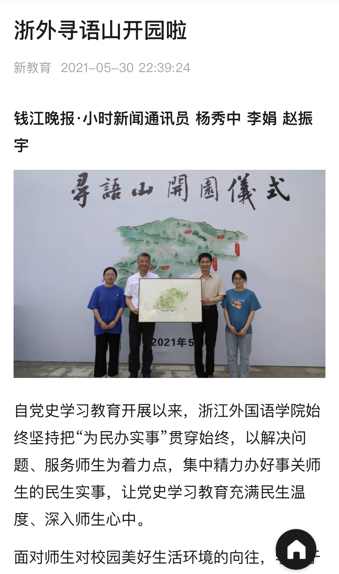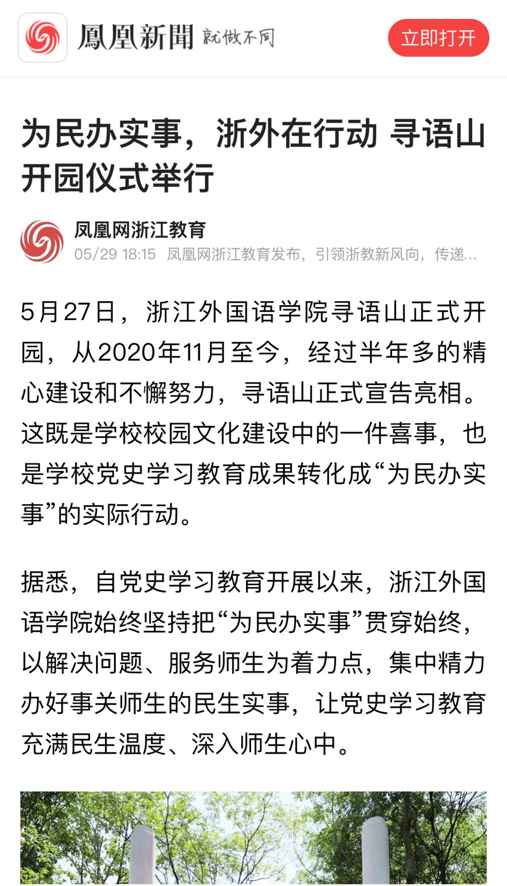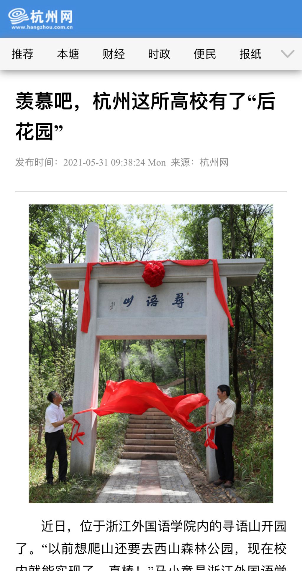 近日,浙外举办寻语山开园仪式。凤凰网、杭州网等多家媒体,分别以“为民办实事,浙外在行动 寻语山开园仪式举行”“羡慕吧,杭州这所高校有了‘后花园’”等为题,关注报道了相关情况。报道中提到,寻语山正式宣告亮相,既是学校校园文化建设中的一件喜事,也是学校党史学习教育成果转化成“为民办实事”的实际行动。
