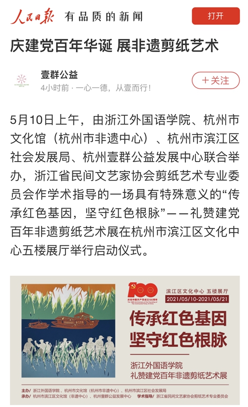 近日,浙外和相关单位联合举办了“传承红色基因,坚守红色根脉”——礼赞建党百年非遗剪纸艺术展。人民日报“人民号”移动新媒体平台以“庆建党百年华诞 展非遗剪纸艺术”为题进行了关注报道。