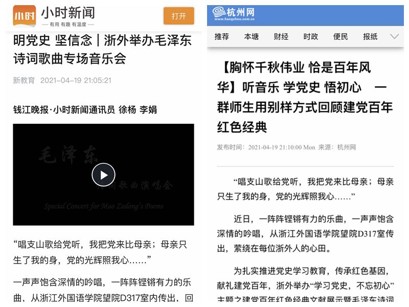 近日,钱江晚报.小时新闻、杭州网等媒体以《明党史 坚信念 | 浙外举办毛泽东诗词歌曲专场音乐会》、《听音乐 学党史 悟初心 一群师生用别样方式回顾建党百年红色经典》等为题,报道了浙外举办建党百年红色经典文献展示暨毛泽东诗词专场音乐会。