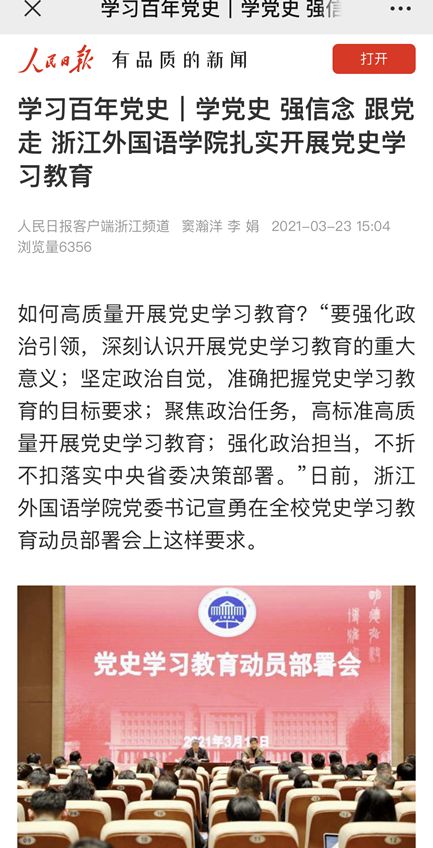 报道中提到,此前,校党委制定了全校《关于开展党史学习教育的实施方案》,并带头开展专题学习活动。学校各二级党组织也纷纷结合各自院系(部)特色、专业优势,或邀请老党员讲党课、或带领师生实地参观学习、或通过身边人讲党史故事,创新方式学,结合实际学,开展了一系列内容丰富、形式多样的党史学习教育活动,在师生中掀起了一股“学党史”的热潮。