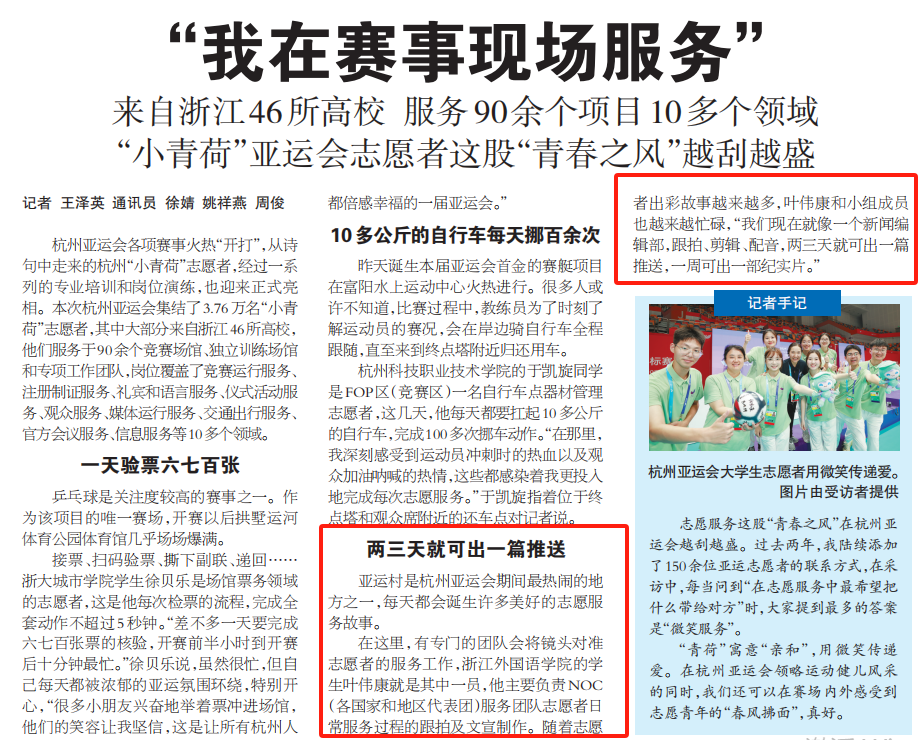 9月23日-25日,杭州日报、杭州新闻以《我在赛事现场服务》《每次验票不超过5秒,一天挪车100多次…… 大学生志愿者:我在现场,服务亚运》为题,报道了开云官网“小青荷”叶伟康用镜头记录身边“小青荷”志愿服务故事的情况。