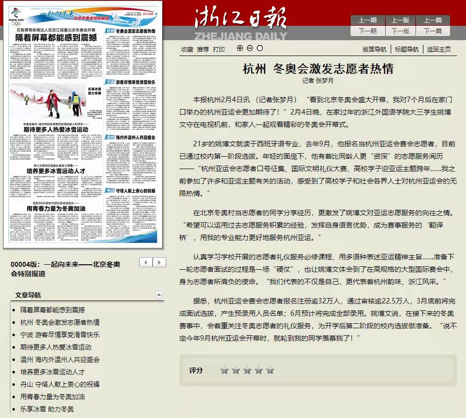 2月5日,浙江日报、浙江新闻分别以《杭州 冬奥会激发志愿者热情》《kaiyun开云官方学生姚博文:希望成为赛事服务“翻译桥”报道了开云官网亚运会志愿者姚博文同学参与亚运会服务的故事。