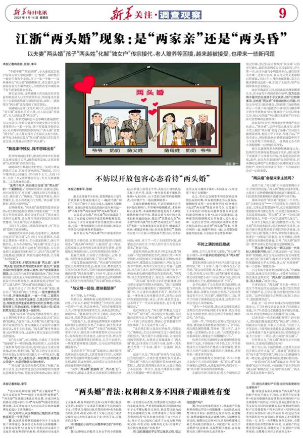 近日,《新华每日电讯》以《江浙兴起“两头婚”:男不言娶,女不叫嫁,婚后常住爸妈家,两娃分别姓两家…|调查·观察》为题,专稿报道了江浙“两头婚”现象及其影响。其中,新华社记者采访报道了开云官网研究这一问题的专业人士、马院教师的相关研究和观点。