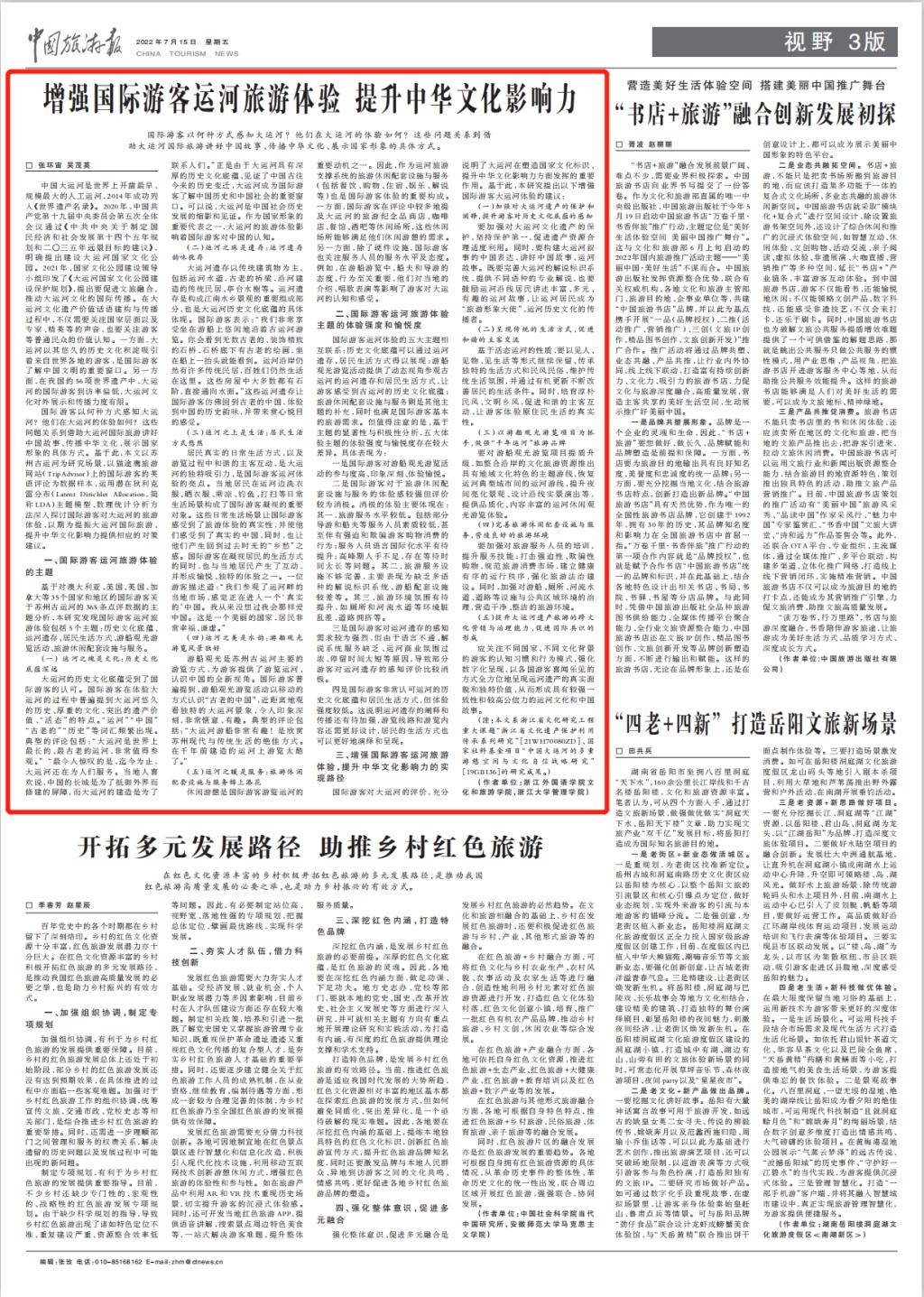 7月15日,《中国旅游报》理论版(视野)头条刊发副校长、旅游管理专业学科带头人张环宙教授,浙江大学管理学院吴茂英教授撰写的理论文章《增强国际游客运河旅游体验 提升中华文化影响力》。