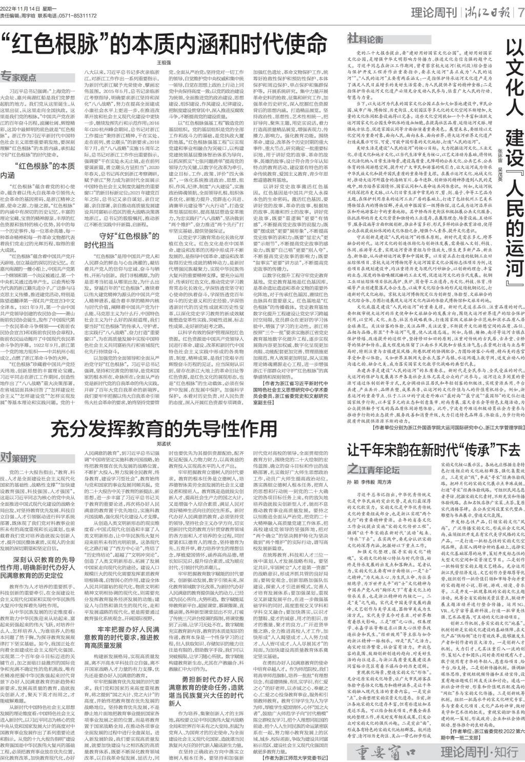 11月14日,《浙江日报》理论版刊发副校长、旅游管理专业学科带头人张环宙教授,浙江大学管理学院吴茂英教授撰写的理论文章《以文化人建设“人民的运河”》。
